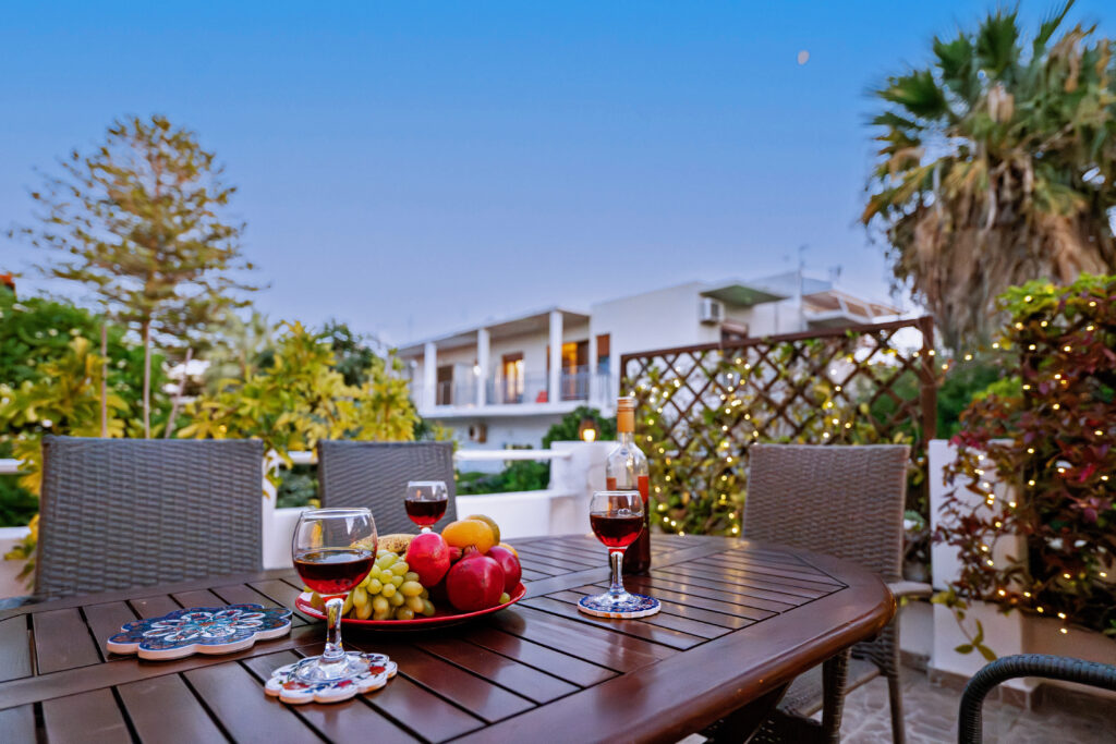 The front balcony is located at the front of the house and overlooks the pine-lined road leading to the Acropolis of Rhodes.