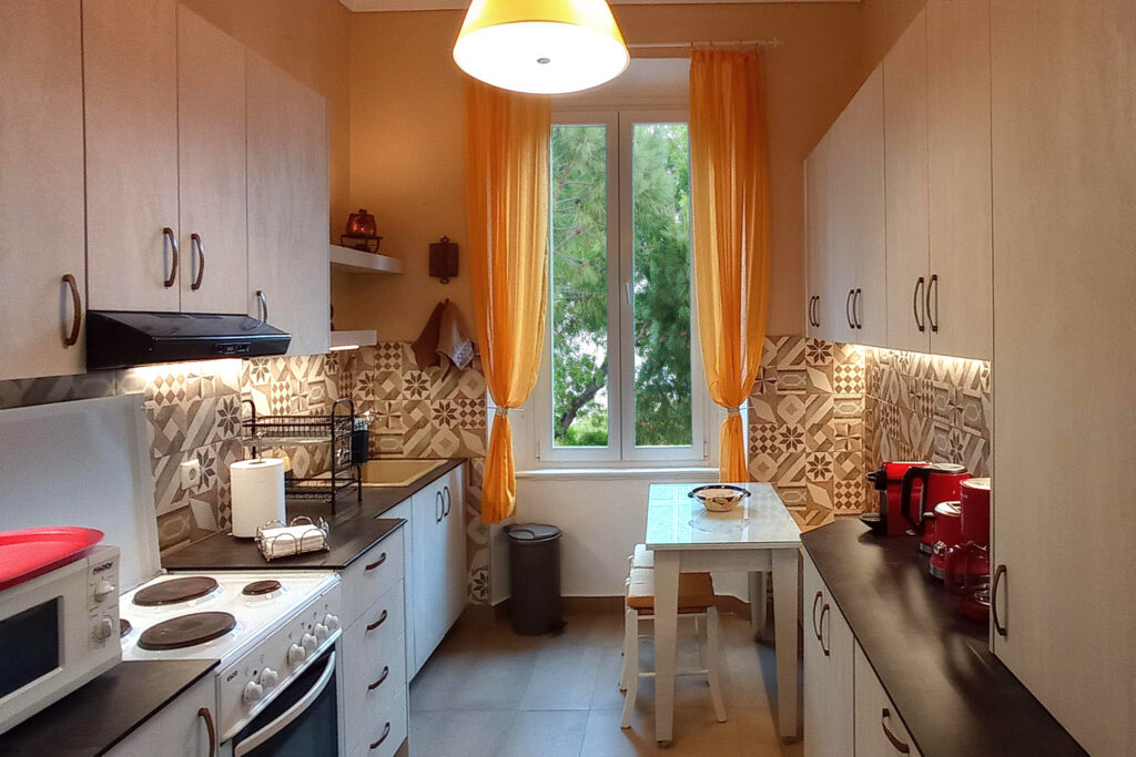 The apartment is located on the first floor of a renovated building dating back to the Italian period, on a beautiful pine-lined street with views of the sea and the city of Rhodes.